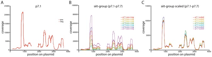 Figure 2. Invitrosome coverage plots for an alternative plasmid backbone (the sèt-group plasmids) also show near identical coverage patterns.2A Example coverage plot for one of the sèt-group plasmids (p7.1) with both forward (pos) and reverse (neg) invitrosomes plotted separately on the same graph. 2B Non-scaled coverage plots with forward and reverse invitrosomes (pos+neg) combined for each of the seven sèt-group plasmids plotted on the same graph. 2C Combined and scaled coverage plots for all seven sèt -group plasmids, where for direct comparison, each plot is normalized to the plasmid with the least coverage and plotted on the same graph.