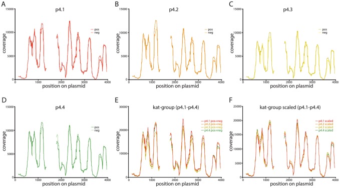 Figure 1. Invitrosome coverage plots for kat-group plasmids show near identical coverage patterns.Invitrosome coverage on each plasmid is plotted on the y-axis and the plasmid coordinates in bp are plotted on the x-axis. Gaps in the plot represent the trimmed insert site and end regions on each plasmid. 1Aâ1D Non-scaled coverage plots with forward (pos) and reverse (neg) invitrosomes plotted separately for plasmids p4.1-p4.4. 1E Non-scaled coverage plots with forward and reverse invitrosomes (pos+neg) combined for each plasmid. All four kat-group plasmids are shown together. 1F Combined and scaled coverage plots for all four kat-group plasmids where each plot is normalized to the plasmid with the least coverage for direct comparison.