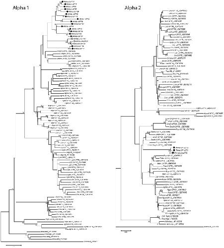 Figure 3. Amino acid alignment of MHC class I alpha 1 domain and alpha 2 domain variants.Putative peptide binding sites are indicated with * under each alignment.
