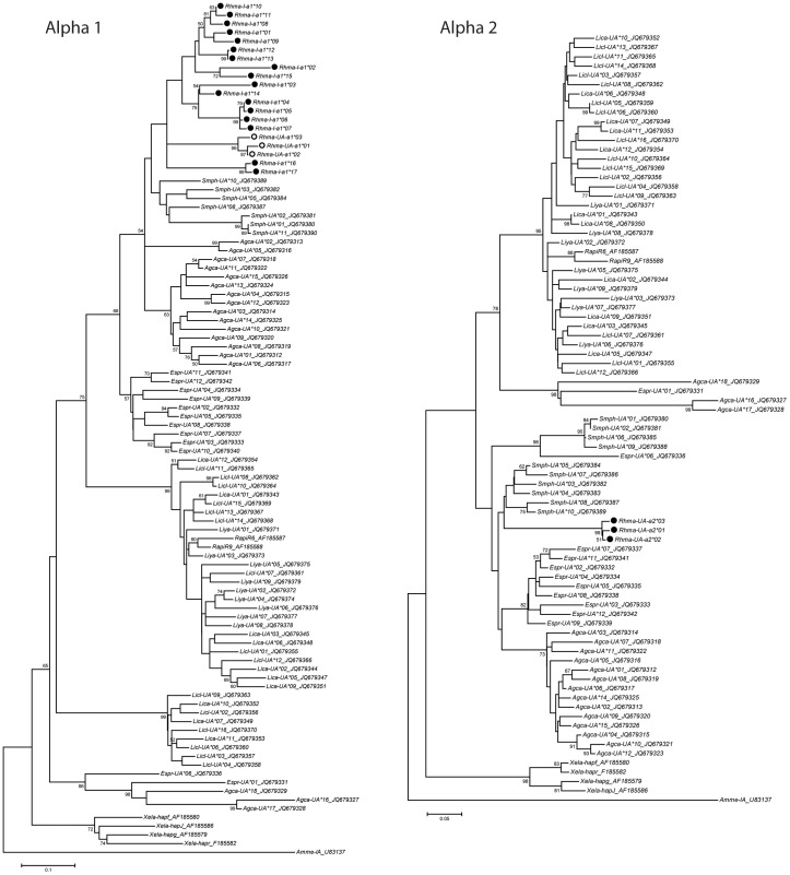 Figure 4. Phylogenetic trees for MHC class I alpha 1 domain and alpha 2 domain.Maximum likelihood phylogenetic trees using General Time Reversible model of nucleotide substitution with invariant sites (rooted on midpoint) comparing Rhinella marina (Rhma) to other anuran species (Xenopus laevis, Xela; Silurana tropicalis, Sitr; Rana temporaria, Rate; Agalychnis callidryas, Agca; Espadarana prosoblepon, Espr; Smilisca phaeota, Smph; Lithobates catesbeianus, Lica; L. clamitans, Licl; L. yavapaiensis, Liya) and axolotl (Ambystoma mexicanium, Amme). Sequence titles include Genbank accessions.