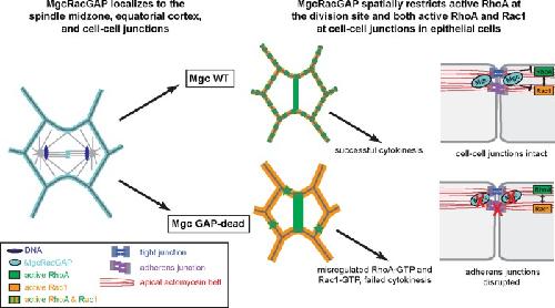 MgcRacGAP restricts active RhoA at the cytokinetic furrow and both RhoA and Rac1 at cell-cell junctions in epithelial cells.