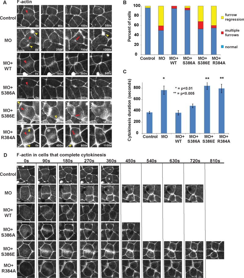 FIGURE 2:. Mgc MO, MO + MgcS386E, and MO + MgcR384A exhibit cytokinesis failure and significant delays in cytokinesis completion in vivo. (A) Frames from time-lapse movies during cytokinesis. Embryos were coinjected with the indicated MO and rescue constructs along with mChe-UtrCH (F-actin probe) and mChe-H2B. Red arrowheads point to the contractile ring during early cytokinesis; red arrows indicate cleavage furrow regression; yellow arrowheads point to F-actin–rich junctional accumulations. (B) Quantification of the outcome of cytokinesis showing the percentage of cells that complete cytokinesis normally, fail cytokinesis with cleavage furrow regression, or fail cytokinesis with formation of multiple cleavage furrows. Control (number of cells, embryos, and independent experiments, respectively [n] = 26, 9, 4), MO (n = 29, 8, 4), MO + WT (n = 20, 7, 4), MO + S386A (n = 53, 13, 5), MO + S386E (n = 48, 12, 5), and MO + R384A (n = 19, 3, 3). (C) Quantification of cytokinesis duration. Error bars represent SEM. The p values were calculated from pairwise comparison to MO + MgcWT. Control (n = 20, 7, 5), MO (n = 17, 8, 7), MO + WT (n = 17, 11, 7), MO + S386A (n = 22, 12, 5), MO+S386E (n = 20, 9, 4), and MO + R384A (n = 20, 9, 4). (D) Frames from time-lapse movies of cells expressing mChe-UtrCH (F-actin probe) that do manage to complete cytokinesis successfully show that the MO, MO + MgcS386E, and MO + MgcR384A cells display significantly longer cytokinesis duration than control or MO + MgcWT. Scale bars, 20 μm. |