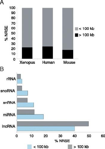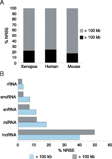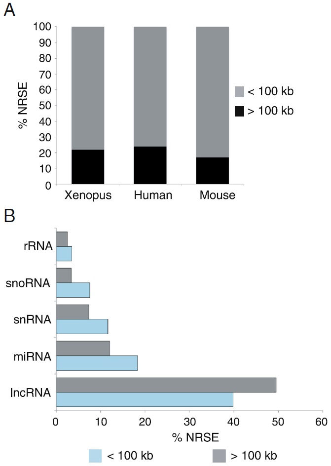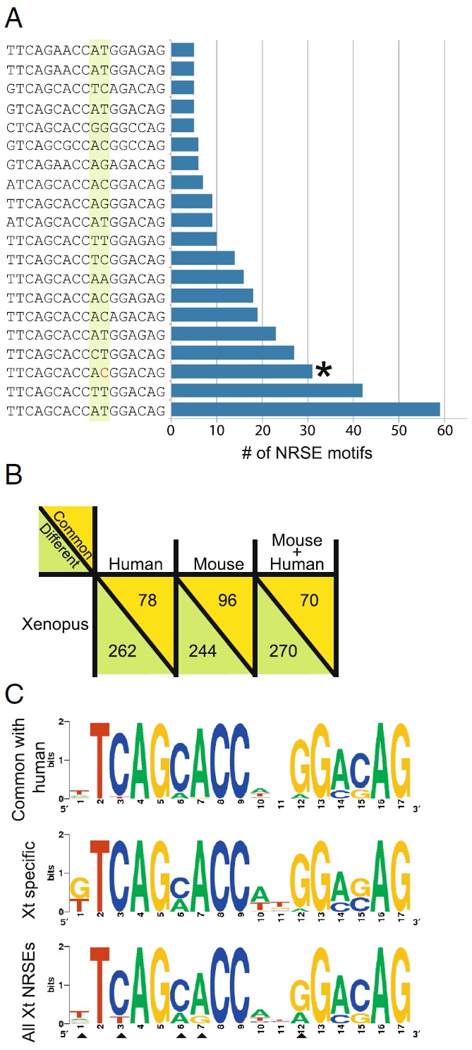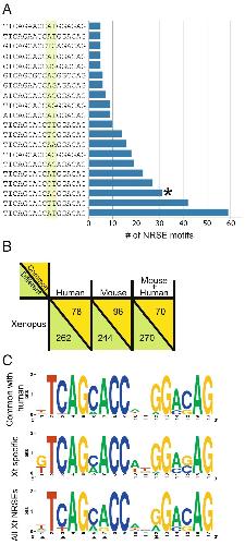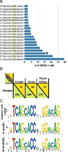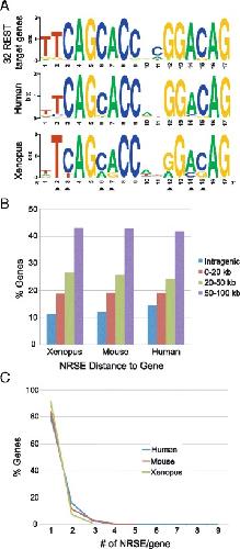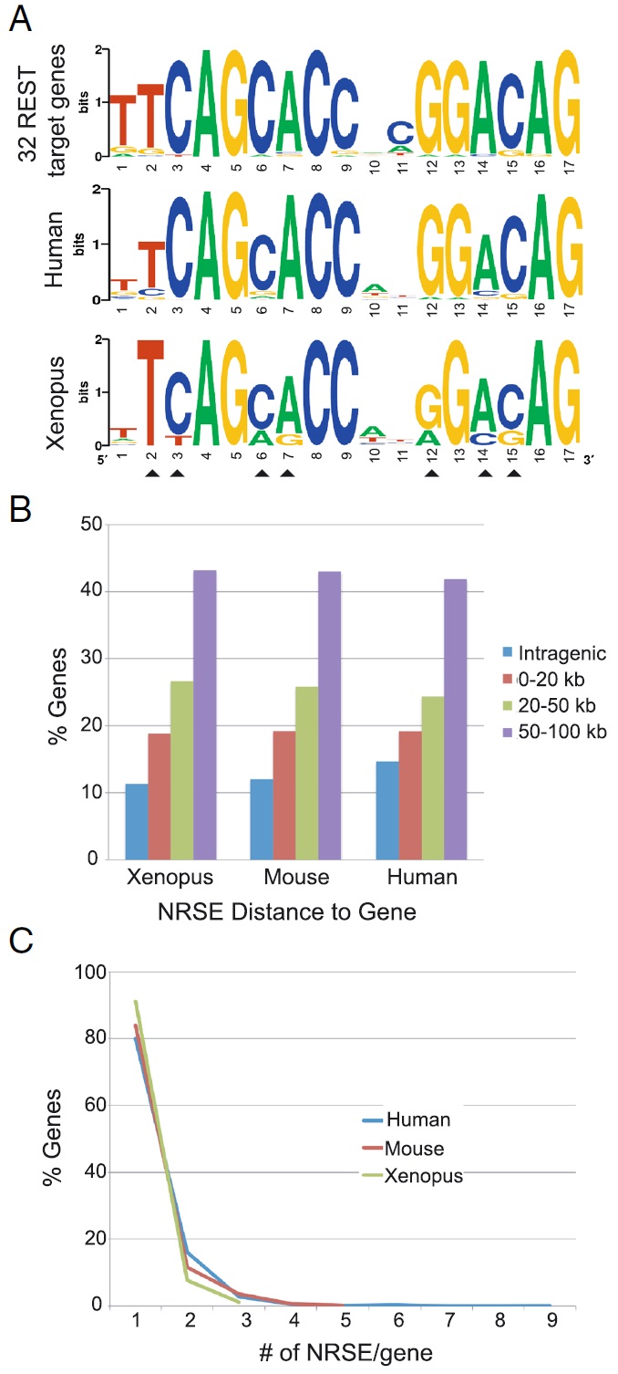 A major role of REST (repressor element-1 silencing transcription factor) is to inhibit the expression of neuronal genes in neural stem cells and non-neuronal cells by binding to a 21 bp consensus sequence and recruiting epigenetic and regulatory cofactors to gene regulatory regions. In neural stem cells, REST silences differentiation-promoting genes to prevent their premature expression and is central to the regulation of neurogenesis and the balance of neural stem cells and neurons. To understand the role of REST in vertebrate neurogenesis, we performed a genome-wide screen for REST targets in Xenopus tropicalis. We identified 742 neuron-restrictive silencer elements (NRSE) associated with 1396 genes that are enriched in neuronal function. Comparative analyses revealed that characteristics of NRSE motifs in frog are similar to those in mammals in terms of the distance to target genes, frequency of motifs and the repertoire of putative target genes. In addition, we identified four F-box ubiquitin ligases as putative REST targets and determined that they are expressed in neuronal tissues during Xenopus development. We identified a conserved core of putative target genes in human, mouse and frog that may be fundamental to REST function in vertebrates. We demonstrate that NRSE sites are associated with both protein-coding genes and lncRNAs in the human genome. Furthermore, we demonstrate that REST binding sites are abundant in low gene-occupancy regions of the human genome but this is not due to an increased association with non-coding RNAs. Our findings identify novel targets of REST and broaden the known mechanism of REST-mediated silencing in neurogenesis.