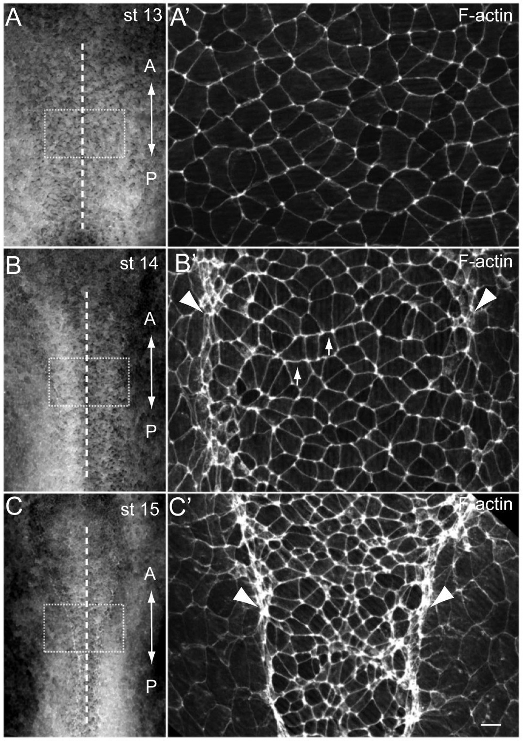 Fig. 1. Polarized F-actin cables in the Xenopus neural plate.F-actin was visualized by phalloidin staining in the Xenopus neural plate at the beginning of neurulation. Representative explants are shown at stage 13 (st. 13, A), st. 14 (B) and st.15 (C). Boxed regions are magnified in A′–C′. Apical constriction of neural plate cells is first evident along the dorsolateral hinge regions (arrowheads), and later throughout the neural plate. F-actin cables become more pronounced in the mediolateral rather than anteroposterior orientation, forming stripes along anteroposterior cell faces (arrows). The anteroposterior (‘A–P’) axis of the neural plate is indicated. Dashed line, the neural plate midline. Scale bar, 20 µm. |
