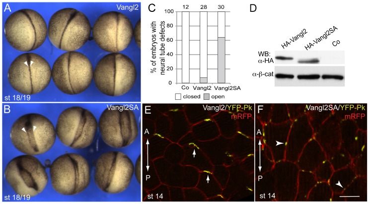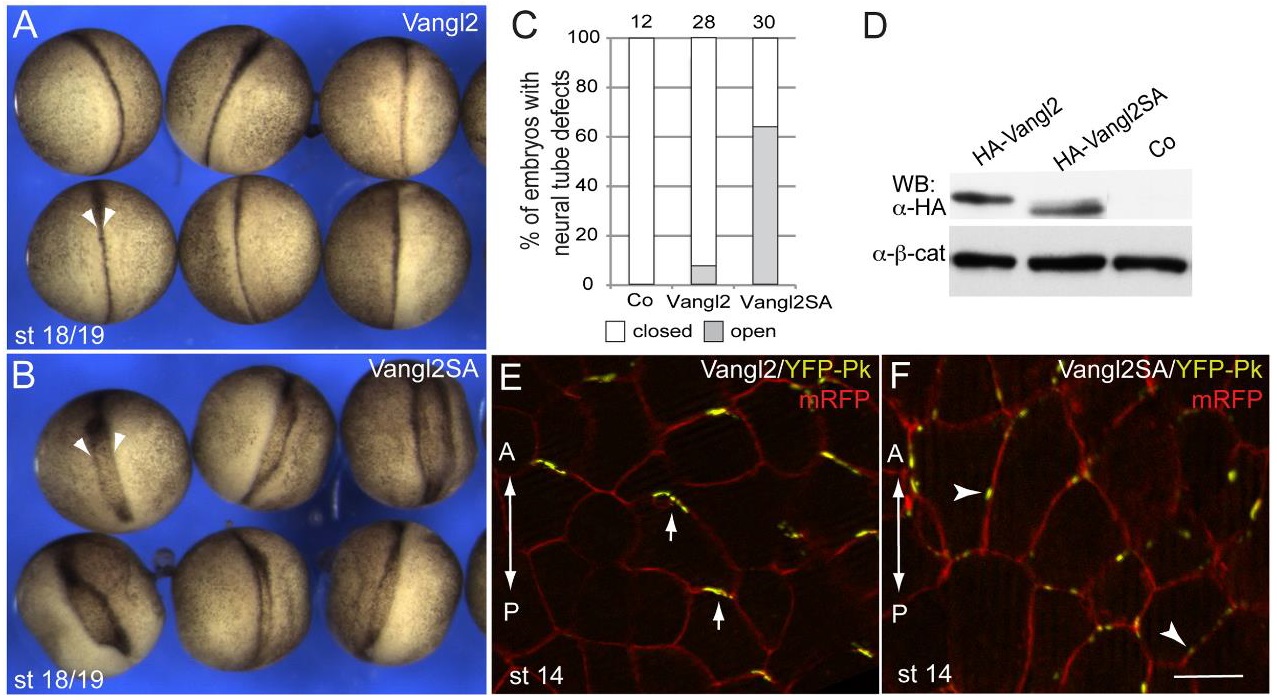 Fig. 5. Wnt-induced Vangl2 phosphorylation in the establishment of the Vangl2 polarity.(AâC) Different activities of overexpressed Vangl2 and Vangl2SA RNAs on neural plate closure. (A) Normal neurulation in embryos overexpressing wild-type Vangl2 RNA (100â pg). (B) Neural tube defects in embryos overexpressing Vangl2SA RNA (100â pg). (C) Quantification. (D) Immunoblot analysis with anti-HA antibodies shows comparable levels of Vangl2 constructs. Anti-β-catenin antibodies reveal protein loading. Note faster migration of non-phosphorylatable Vangl2. The image of lane containing uninfected embryo lysate (Co) is obtained from the same gel. (E,F) Phosphorylation of Vangl2 is critical for the establishment of AP-PCP. YFP-Pk mRNA (50â100â pg) was unilaterally coinjected with HA-Vangl2 RNA or HA-Vangl2SA RNAs (100â pg each) at the 8-cell stage. mRFP RNA (100â pg) is a lineage tracer. AP-PCP is assessed by the recruitment of Pk to anterior (arrows) or lateral (arrowheads) cell edges near the neural midline (st 14/15) in the presence of HA-Vangl2 or HA-Vangl2SA. Scale bar, 20â µm. |
