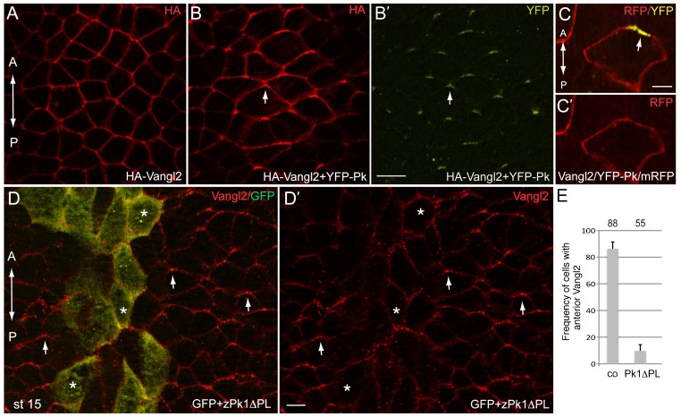 Fig. 3. Vangl2 polarity is directed by Prickle.Early embryos were injected with HA-Vangl2 (150â pg) and YFP-Pk RNAs (100â pg) either separately or together as indicated. At early neural plate stage, embryos were fixed and immunostaned with anti-HA or anti-GFP antibodies. (A) HA-Vangl2 is homogeneously distributed at cell boundaries. (B,Bâ²) The complex of Vangl2/Pk is polarized at the anterior end of each cell. HA-Vangl2 (B) and YFP-Pk (Bâ²). (C,Câ²) The anterior localization of the Vangl2/YFP-Prickle complex in an expressing cell is visualized by YFP and membrane RFP (mRFP) epifluorescence. (D,E) Early embryos were coinjected with zPk1ÎPL RNA (1.5 to 2â ng) and GFP as lineage tracer (100â pg). (D,Dâ²) Immunofluorescence reveals Vangl2 anterior accumulation (arrows) in the neural plate, with the exception of the cells containing zPk1ÎPL (marked by GFP, asterisks). Dorsal view of the neural plate midline is shown, anterior is to the top. (E) Quantitation of the data shown in D. See also Fig. 4C for control RNA effect. Error bars represent s.d. Co, control cells on the uninjected side. Scale bars are 20â µm in B,D, and 5â µm in C. |