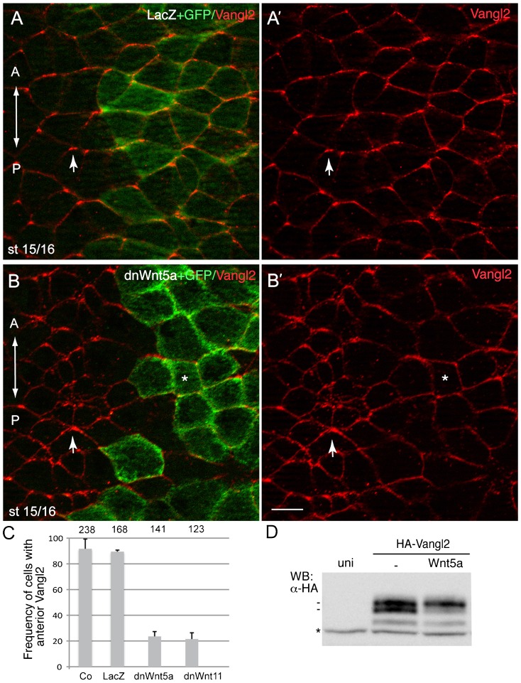 Fig. 4. A role of Wnt signaling in establishing the Vangl2 polarity.(A,B) Early embryos were injected with DN-Wnt5a RNA (0.3 ng) and GFP RNA (0.1 ng) as a lineage tracer. Neural plate cells mosaically expressing this construct reveal lack of Vangl2 enrichment at the anterior of each cell (asterisks) as compared to non-expressing cells (arrows). A', B' are single-channel images corresponding to A and B. Control LacZ RNA (1.5 ng) coinjected with GFP RNA (0.1 ng) had no effect on anterior distribution of Vangl2. Dorsal view of the neural plate is shown, anterior is to the top. Scale bar, 20 µm. (C) Quantification of data from the experiments with DN-Wnt constructs showing mean frequencies of cells with anterior Vangl2±s.d. At least 5–10 embryos were examined per each treatment. Numbers of scored cells are shown on top of each bar. (D) Vangl2 is phosphorylated in response to Wnt5a in Xenopus ectoderm. Early embryos were injected with HA-Vangl2 mRNA (0.1 ng) together with Wnt5a RNA (0.5 ng). Cell lysates were prepared at the midgastrula stage (st. 11) for western analysis with anti-HA antibodies. Wnt5a causes HA-Vangl2 to migrate slower in whole embryo lysates (st. 11). Asterisk indicates a non-specific protein band reflecting protein loading. |