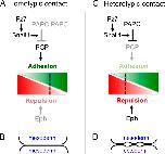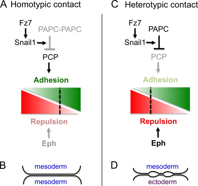 Figure 1. Signaling and responses to cell interactions. (A) At homotypic contacts of mesoderm cells, the PCP pathway can promote adhesion (green) because PAPC complexes form that have low PCP inhibitory activity. Eph receptor activation that promotes repulsion (red) is weak because coexpressed ephrins have low affinity. Consequently, the balance of cell responses favors adhesion (B). (C) At heterotypic contacts, free PAPC inhibits the PCP pathway. This PAPC activity requires Fz7-induced expression of Snail1. Eph receptors are strongly activated by high affinity ephrins expressed in ectoderm. Consequently, there is a balance of repulsion and adhesion that leads to formation of cleft contacts, characterized by interspersed stretches of adhesion and intercellular gaps (D).
