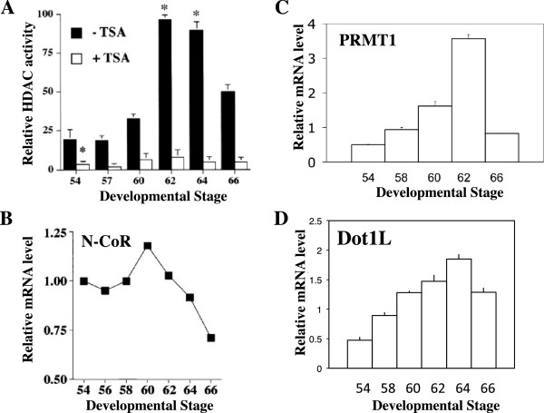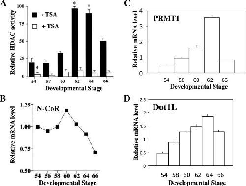 Figure 2. Upregulation of genes involved in epigenetic modifications during intestinal stem cell development. (A) HDAC activity. Intestinal protein extracts were prepared from Xenopus laevis tadpoles at different stages and assayed for HDAC activity in the presence or absence of 10 nM TSA, an HDAC inhibitor. Means +/- SEMs are given. Statistical significance as compared with the stage 54 animals is expressed as *: P <0.01. Note that the HDAC-specific drug TSA inhibited all activities. See [91] for details. (B)-(D). The relative mRNA levels of N-CoR (B), PRMT1 (C), and Dot1L (D). The mRNA levels were determined by using total RNA from intestine at different stages during Xenopus laevis development. See [76, 87, 98] for details. |