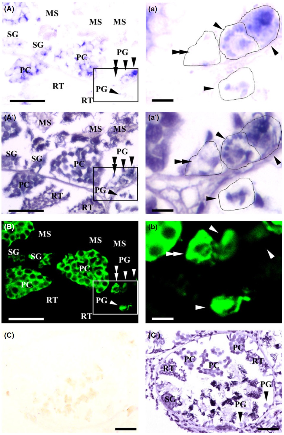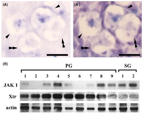 JAK1 mRNA in the PGs was detected by in situ hybridization on the sections from Cytochalasin B-treated adult testis (Aâ, Aâ, Bâ, and Bâ)