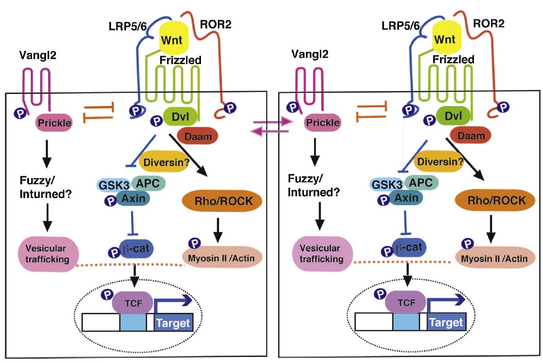 Fig. 1. Two major Wnt pathway branches.The canonical Wnt/-catenin pathway antagonizes the -catenin destruction complex, consisting of Axin, GSK3 and APC to promote target gene transcription. By contrast,the Wnt/PCP pathway is thought to involve Frizzled/Dishevelled signaling to locally activate RhoA, ROCK and Myosin II and, at the same time, precludes the recruitment ofVangl2/Prickle to the same membrane subdomain. Roles of the vertebrate PCP proteins Fuzzy, Inturned and Diversin in PCP are unclear. Besides the mutually antagonisticinteractions inside the cell, PCP is coordinated by the positive feedback between the Frizzled/Dishevelled complex and the Vangl2/Prickle complex across the cell junction.Two neighboring epithelial cells are shown. |