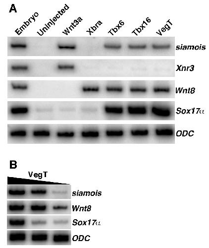 formation. (A) RT-PCR analysis of siamois ectopic expression in ectoderm explants injected with