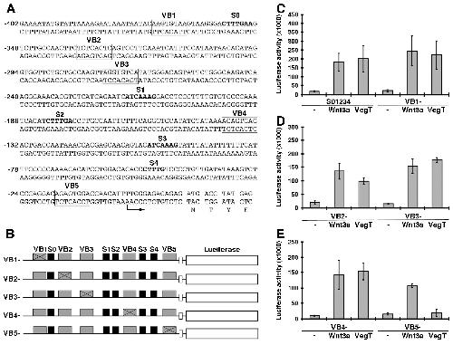 VB3 or VB4 does not affect the response of siamois promoter to Wnt3a or VegT. Mutation of VB5