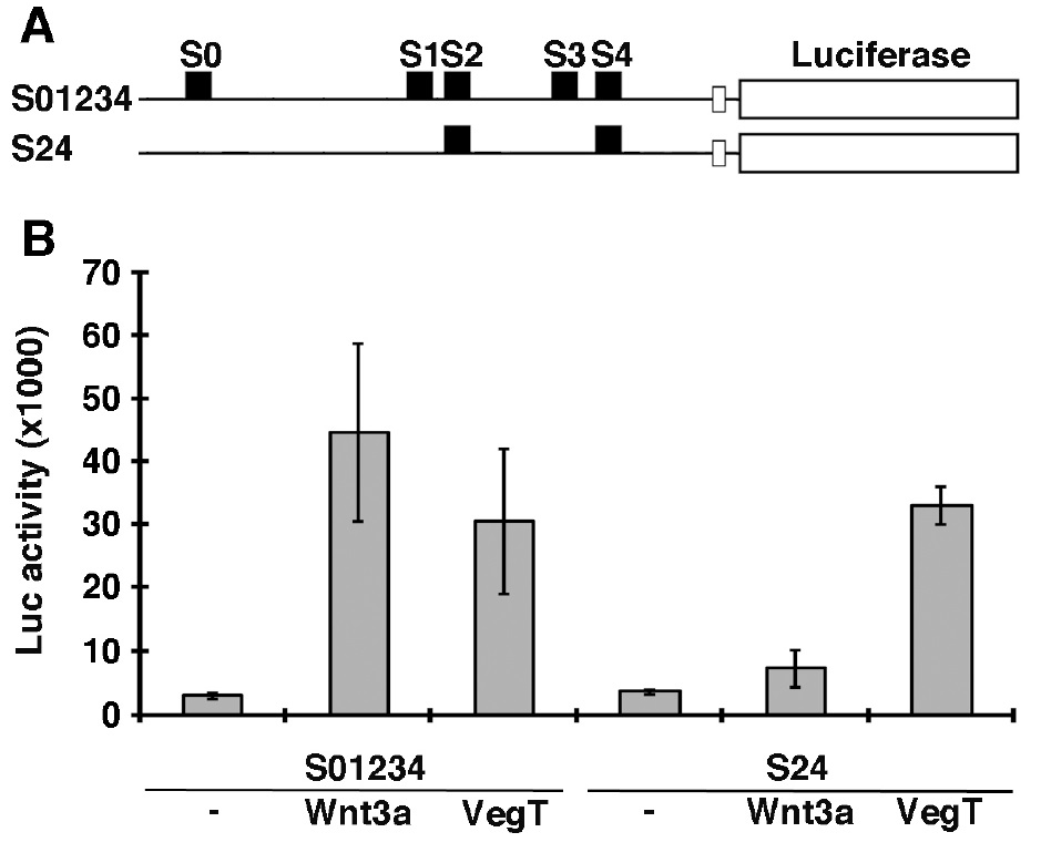 Wnt3a, also activates the S24 siamois promoter mutated at the S0, S1 and S3 Tcf/Lef-binding sites.