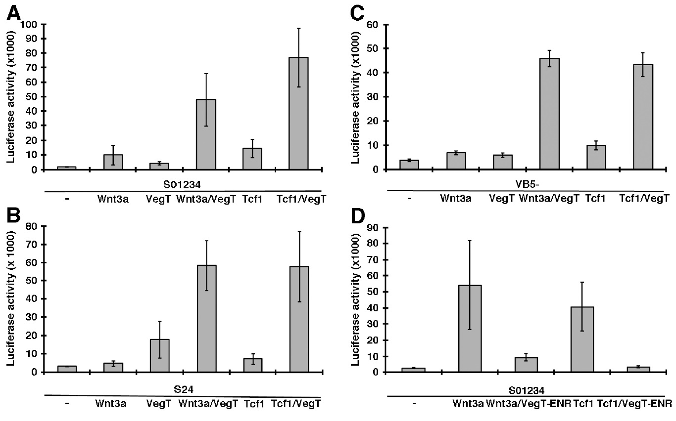 VegT cooperates with Wnt3a or Tcf1 to activate the VB5- siamois promoter reporter mutated at VB5