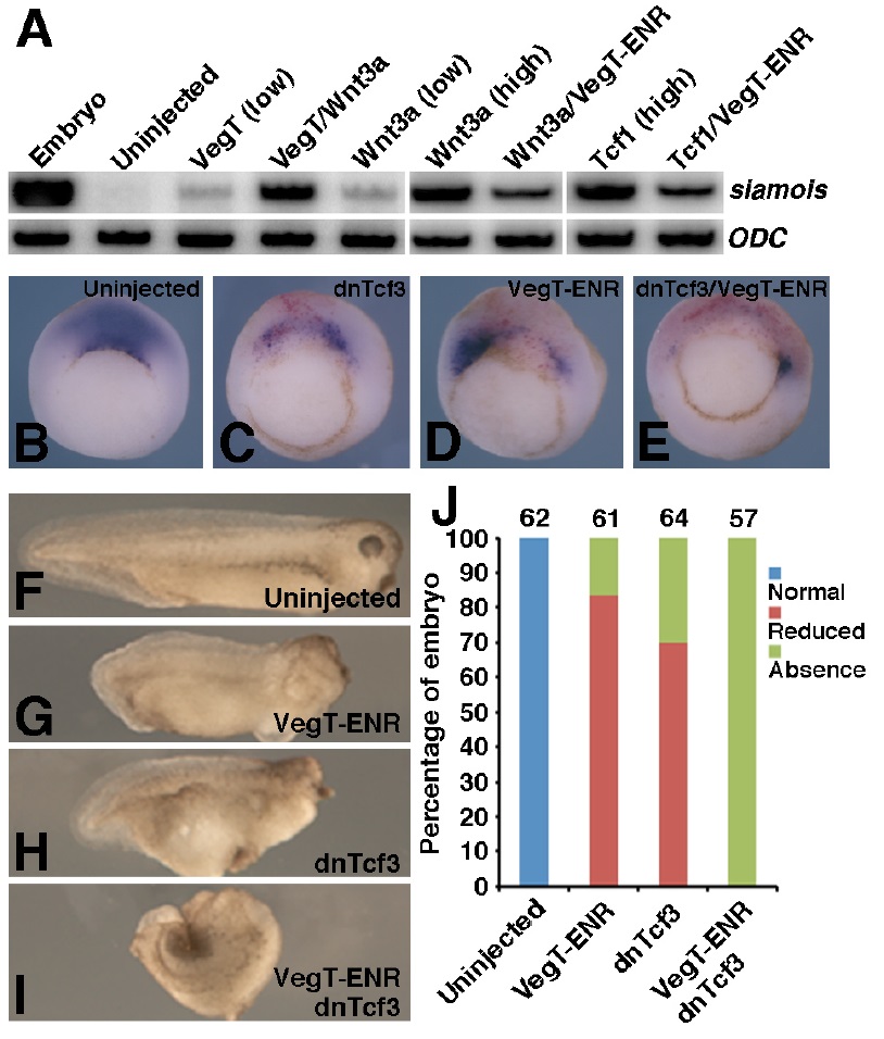 dnTcf3 and VegT-ENR (I), at the late tail-bud stage. (J) Statistical analysis of the phenotypes.