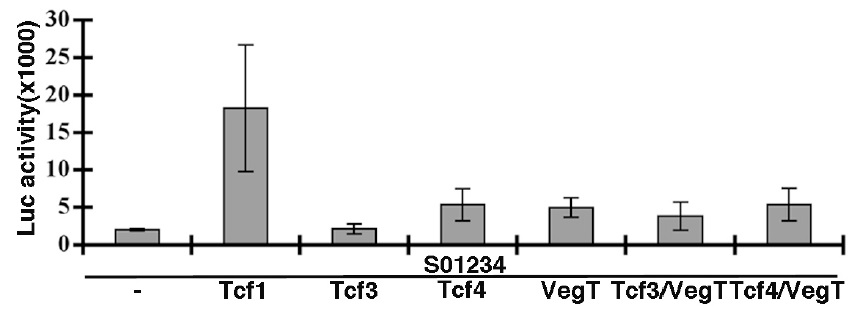 Tcf3 did not activate the promoter and Tcf4 exhibited a weak activity. Single injection of Tcf1, Tcf3