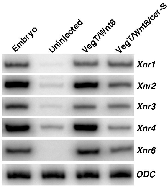analysis. Coinjection of cer-S mRNA inhibited the expression of Xnr2, Xnr4 and Xnr6, but not