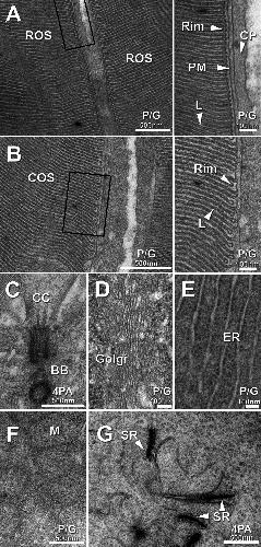 TEM of photoreceptors derived from plastic-embedded retinal cryosections. Rod outer segments (ROS) (A) and cone outer segments (COS) (B) are well preserved with plasma membrane (PM), disk rims (Rim), disk lamellae (L) and calycal processes (CP) well resolved. The more complex organization of the cone outer segment disks is readily apparent. In addition, other intracellular structures are well preserved, including features of the connecting cilium (CC) and basal body (BB) (C), Golgi (D), endoplasmic reticulum (ER) (E), mitochondria (M) (F), and synaptic ribbons (SR) (G). C, G fixed in 4% paraformaldehyde (4 PA), all other images 4% paraformaldehyde 1% glutaraldehyde (P/G).