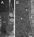 Artifacts associated with TEM of plastic-embedded retinal cryosections. A: cone photoreceptor outer segments lack definition in the region typically occupied by glycogen granules (GG). OD = oil droplet. Right: outer segment disk lamellae (L) are less well defined in samples fixed without glutaraldehyde, although disk rims (Rim) and plasma membrane (PM) are typically well defined. Left: 4% paraformaldehyde 1% glutaraldehyde (P/G). Right: 4% paraformaldehyde (4 PA).