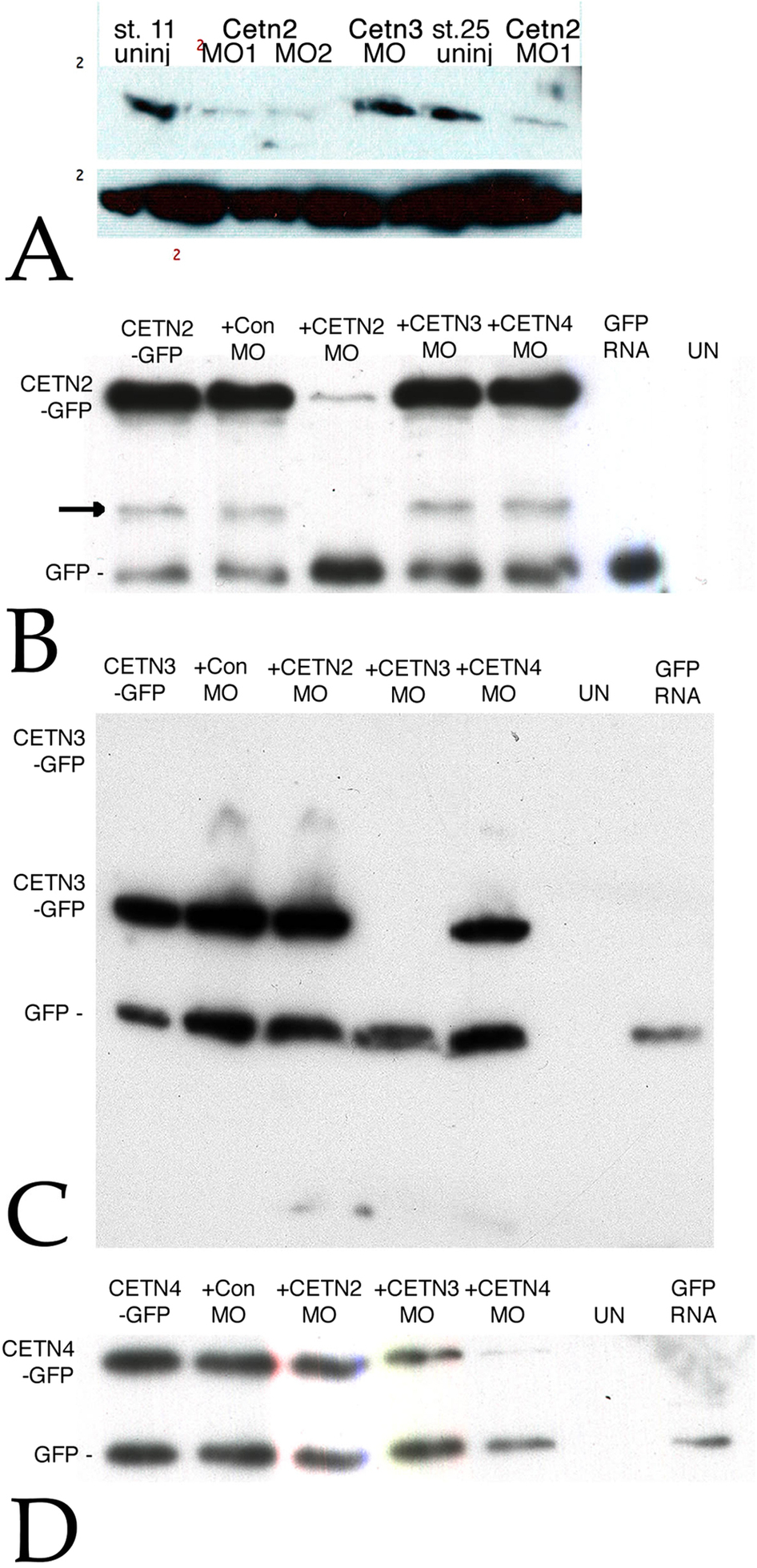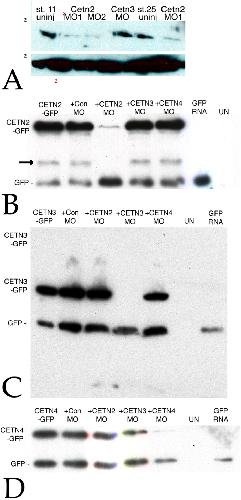 Figure 2. A: Embryos were injected into both cells at the two cell stage with RNAs encoding GFP (150 pgs per embryo) either alone or together with Cetn2MO1, Cetn2MO2, or Cetn3MO (10 ngs/side, 20 ngs total per embryo); at stage 11 or 25 the embryos were analyzed by SDS-PAGE and immunoblot using the anti-Human Cetn-1 antibody (which reacts preferentially with Cetn2 compared to Cetn3. There was a clear decrease in Cetn2 protein levels, persisting through stage 25. To confirm the specificities of the Cetn MOs both blastomeres of two cell embryos were injected with RNAs encoding GFP (200 pg/side) and RNAs encoding Cetn2a-GFP (B), Cetn3l-GFP (C), or Cetn4-GFP (D) RNAs with (“+”) or without Cetn MO (10 ng/side). These Cetn RNAs contain the target sequence of the corresponding morpholino. In addition, uninjected (“UN”) and embryos injected with GFP RNA alone were examined as controls for antibody specificity. Injected embryos were harvested at stage 11. Immunoblot analyses were carried out using an anti-rabbit GFP antibody. An apparent breakdown product of the Cetn2-GFP construct is indicated by the arrow in the Cetn2 MO panel. |