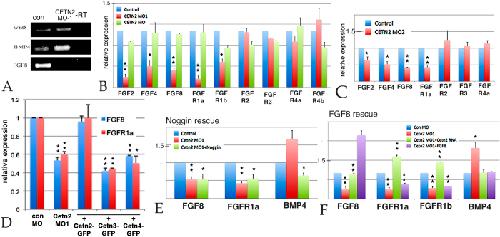 Figure 4. A: PCR analysis of control and Cetn2 MO embryos; there was a clear increase in BMP4 RNA, the disappearance of FGF8 RNA, and no apparent effect on Wnt8 RNA: B: qPCR analysis of Control, Cetn2MO1 and Cetn3MO embryos, injected in both cells of a two cell embryo and harvested at stage 11. C: A similar analysis carried out with the Cetn2MO2. D: qPCR analysis of embryos injected in both cells of a two cell embryo with Cetn2MO1 alone or together with Cetn2-GFP, Cetn3-GFP, or Cetn4-GFP RNAs (RNAs injected at 200 pg/side, total 400 pg/embryo; MOs injected at 10 ng/side, total 20 ng/embryo). While Cetn2-GFP RNA rescued the morphant phenotype Cetn3 or Cetn4 RNAs did not. E: qPCR analysis of embryos injected in both cells of two-cell embryos with Cetn2MO1 alone or together with Noggin RNA (200 pgs/embryo); Noggin reversed the morpholino effect on BMP4 RNA level but not the effect on FGF8 or FGFR1a RNA levels. F: qPCR analysis of embryos injected in both cells of a two cell embryo with Cetn2MO1 alone or together with either Cetn2-GFP or FGF8 RNAs (200 pgs/embryo); Cetn2 RNA rescued the Cetn2 morpholino’s effects on RNA levels, FGF8 reversed the effect on BMP4 RNA, but not the effects on FGFR1a RNAs. Levels of statistical significance indicated single * <0.05, double ** <0.001. |