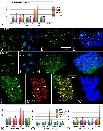 Figure 5. A: Unmaninpulated X. tropicalis embryos were isolated at stage 11, subjected to ChIP using 2 μg of either anti-GFP antibody (as control), anti-Xenopus Cetn antibody, anti-human Cetn1 antibody, or anti-Pol II antibodies. Isolated embryonic DNA was analyzed by qPCR using primers directed against the FGF8 promoter region. The distance from the transcription start site (TSS) is noted. For similar studies in X. laevis, we first characterized the behavior of the myc-Cetn2-GFP and myc-Cetn3-GFP polypeptides in ectodermal explants. Fertilized eggs were injected with encoding either myc-Cetn2-GFP RNA (B-E), myc-Cetn3-GFP RNA (F-I), or both Cetn2-RFP and myc-Cetn3-GFP RNAs (K-M)(each RNA injected at 200 pg/embryo). Ectodermal explants were isolated at stage 9 and fixed at stage 18. Immunofluorescence staining was performed using both anti-GFP and anti-AAT antibodies; scale bar in part G indicates 10 μm for parts B,C,F and G. Scale bar in parts D & L indicates 5 μm for parts D,E,H,I and J-M. Confocal images were taken at either 40X (B,C,F,G) or 100X (D,E,H,I,J-M) magnification. It is readily apparent that both myc-Cetn2-GFP and myc-Cetn3-GFP polypeptides accumulate in ciliated cells. In explants expressing both myc-Cetn3-GFP (J) and Cetn2-RFP (K; overlap in panel L, panel M is ATT staining), there was both extensive overlap in the localization of Cetn2 and Cetn3 polypeptides (arrow marked “2 + 3”), as well as sites where one or the other predominates (arrows marked either “2” or “3”). For ChIP studies in X. laevis, both blastomeres of 2-cell stage embryos were injected with RNAs encoding either GFP, myc-Cetn2-GFP, or myc-Cetn3-GFP; uninjected embryos were used as a control. Embryos were harvested at stage 11. GFP antibody was used to immunoprecipitate the injected embryos and Pol II antibody was used to immunoprecipitate the uninjected embryos. qPCR analysis was performed to check protein binding to the FGFR1a (N), FGF8 (O) and BMP4a (P) promoter regions. |