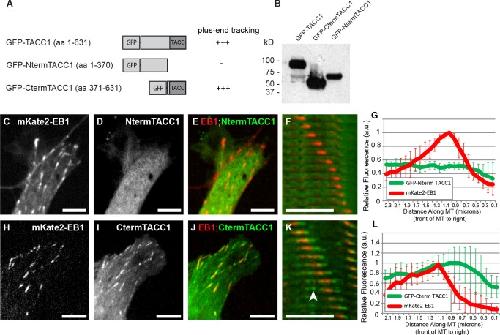 Figure 2. The C‐terminal TACC domain is necessary and sufficient for MT plus‐end tracking. (A) Schematic representation of GFP‐tagged TACC1 protein and deletion constructs. The amino acid residue numbers refer to those listed in Fig S1A in Supporting Information. (B) Western blot of embryonic lysates following expression of constructs, blotted for GFP. This blot is intentionally overexposed in order to reveal the smaller band in the full‐length construct lane. Expression of mKate2‐EB1 (to identify MT plus‐ends; C, H), GFP‐tagged TACC1 constructs (D, I), and merged images of both channels (E, J). Plus‐end accumulation is apparent in I (with GFP‐CtermTACC1) but not in D (with GFP‐NtermTACC1); see also Movies S5 and S6 in Supporting Information. (F, K) Magnified time‐lapse montages of a representative EB1 comet from cell in (E, J) confirms that CtermTACC1 localizes to growing MT plus‐ends, while NtermTACC1 does not. Arrowhead in (K) points to MT lattice binding. The time interval between frames in panel F is 3.3 s and panel K is 2.1 s. (G, L) Fluorescence intensity profiles of GFP‐TACC1 constructs and mKate2‐EB1. For each plot, signals from 10 MTs were quantified by intensity line scans to present the relative fluorescence intensity profiles, with the plus‐end of the MT toward the right. For K, the green channel has been translated to the left (approximately 0.1 µm) based on each individual MTs velocity, to account for the time displacement between channels. GFP‐Cterm TACC1 comets were consistently longer than full‐length GFP‐TACC1 (compare Figs. 2L to 1J). Bar 5 µM. |