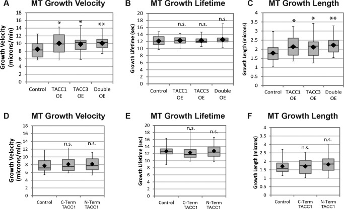 Figure 3. TACC1 overexpression (OE) increases MT growth velocities. Quantification of MT growth track parameters after TACC1 and TACC3 overexpression in cultured embryonic mesenchymal cells derived from neural tube. TACC proteins are expressed approximately twice as much as in controls. mKate2‐EB1 localizes to the ends of growing MTs and is thus a marker for MT polymerization. Automated tracking of mKate2‐EB1 comets is used to calculate MT growth track velocity (A), MT growth track lifetime (B), and MT growth track length (C). Mean values for all the experiments combined (three were performed in total): MT growth velocity, control, 8.5 µm/min, TACC1 OE 10.1 µm/min, TACC3 OE 9.84 µm/min, double OE 10.1 µm/min; MT growth lifetime, control, 12.1 s, TACC1 OE 12.3 s, TACC3 OE 12.3 s, double OE 12.5 s; MT growth length, control, 1.8 µm, TACC1 OE 2.1 µm, TACC3 OE 2.1 µm, double OE 2.2 µm. Control data are the means of 26 cells, representing a total of 4292 analyzed MT growth tracks; TACC1 OE are from 35 cells and 7606 analyzed MT growth tracks; TACC3 OE are from 38 cells and 9138 MT growth analyzed tracks; double OE are from 30 cells and 7214 MT growth analyzed tracks. (D–F) Quantification of MT parameters after overexpression of TACC1 deletion constructs. Mean values: MT growth velocity, control, 7.7 µm/min, C‐term TACC1 8.1 µm/min, N‐term TACC1 8.2 µm/min; MT growth lifetime, control, 12.7 s, C‐term TACC1 12.3 s, N‐term TACC1 12.8 s; MT growth length, control, 1.7 µm, C‐term TACC1 1.7 µm, N‐term TACC1 1.8 µm. Control data are the means of 40 cells (from 5 individual experiments), representing a total of 9425 analyzed MT growth tracks; C‐term TACC1 data are from 33 cells and 6960 analyzed MT growth tracks; N‐term TACC1 data are from 46 cells and 9701 analyzed MT growth tracks. Box‐and‐whisker plots indicate the mean (diamond), median, extrema, and quartiles. An unpaired t test was performed to assess significance of overexpression conditions compared to control. **P < 0.01, *P < 0.05; n.s., not significant. |