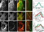 Figure 1. TACC1 can act as a plus‐end tracking protein in embryonic cells. Expression of mKate2‐tubulin (A), GFP‐TACC1 (B), and merge (C) in cultured mesenchymal cells derived from embryonic neural tube; see also Movies S1 in Supporting Information. (D) Magnified time‐lapse montages of the boxed region in panel C. The time interval between frames is 2.9 s. (E) Fluorescence intensity profile of GFP‐TACC1. Signals from 20 individual MTs were quantified by intensity line scans to present the relative fluorescence intensity profiles, with the plus‐end of the MT toward the right. Expression of mKate2‐EB1 (F), GFP‐TACC1 (G), and merge (H) in cultured embryonic mesenchymal cells; see also Movie S3 in Supporting Information. (I) Magnified time‐lapse montage of the boxed region in panel H. The time interval between frames is 2.7 s. For this panel, the green channel has been translated to the left by 0.27 µm to account for the different acquisition times of the red and green channels (the velocity of the plus‐end was consistently moving at 0.27 µm/s in this time series, and the green channel was imaged 1 s after the red channel). This allows for a more accurate visualization of colocalization between the two +TIPs. This demonstrates that, even after correcting for the time displacement, GFP‐TACC1 overlaps with and is distal to mKate2‐EB1. (J) Fluorescence intensity profiles of GFP‐TACC1 and mKate2‐EB1. Signals from 18 MTs were quantified by intensity line scans to present the relative fluorescence intensity profiles, with the plus‐end of the MT toward the right. For each measurement, the green channel has been translated to the left (approximately 0.2 µm) based on each individual MTs velocity, to account for the time displacement between channels. After the correction, the highest peak intensity of GFP‐TACC1 is ∼0.4 μm distal to the peak of mKate2‐EB1. Expression of mKate2‐TACC3 (K), GFP‐TACC1 (L), and merge (M) in cultured embryonic mesenchymal cells; see also Movie S4 in Supporting Information. (N) Magnified time‐lapse montage of the boxed region in panel M. The time interval between frames is 3.9 s. For this panel, the green channel has been translated to the left by 0.25 μm to account for the different acquisition times of the red and green channels (the velocity of the plus‐end was consistently moving at 0.21 µm/s in this time series, and the green channel was imaged 1.2 s after the red channel). (O) Fluorescence intensity profiles of GFP‐TACC1 and mKate2‐TACC3. Signals from 12 MTs were quantified by intensity line scans to present the relative fluorescence intensity profiles, with the plus‐end of the MT toward the right. For each measurement, the green channel has been translated to the left (approximately 0.1 µm) based on each individual MTs velocity, to account for the time displacement between channels. While mKate2‐TACC3 and GFP‐TACC1 mostly overlap, the peak of mKate2‐TACC3 is just slightly distal to GFP‐TACC1. Also, we found that GFP‐TACC1 comets were consistently longer when mKate2‐TACC3 was expressed. Note that mKate2‐TACC3 is less effective at tracking MT plus‐ends than GFP‐TACC3 [observed in Nwagbara et al., 2014]. One reason for this is that the presence of the mKate2 tag leads to more efficient cleavage of the C‐terminal TACC domain (not shown), which is required for MT plus‐end tracking. Moreover, note that in images K–M, yolk granules are strongly autofluorescing. Bar 5 µM. |