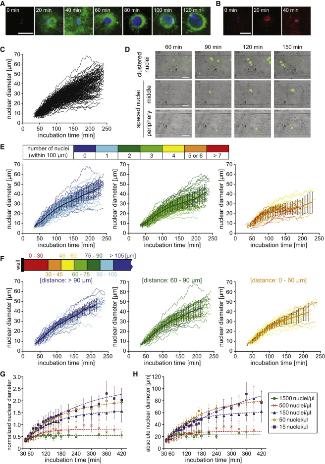 (D) Representative time-lapse images of clustered and spaced nuclei located in the center or close to the edges of the chamber. The nuclei were visualized by imported recombinant GFP-NLS (green). Scale bars, 100 μm. See also Movie S1. Expansion Dynamics of Clustered Nuclei, Related to Figure 1, Movie S2. Expansion Dynamics of an Individual Nucleus Located in the Center of the Chamber, Related to Figure 1 and Movie S3. Expansion Dynamics of an Individual Nucleus Located Close to the Edges of the Chamber, Related to Figure 1.