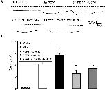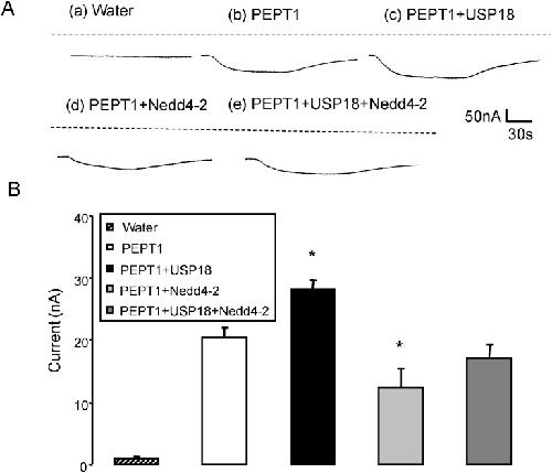 Fig 3. Coexpression of Nedd4-2 decreases electrogenic peptide transport in PEPT1-expressing Xenopus laevis oocytes.A: Representative original tracings showing Igly-gly in Xenopus laevis oocytes injected with water (a), expressing PEPT1 alone (b) or with USP18 (c), Nedd4-2 (d), or with USP18 and Nedd4-2 (e). B: Arithmetic means ± SEM (n = 13–15) of Igly-gly in Xenopus laevis oocytes injected with water (striped bar) or expressing PEPT1 without (white bar) or with USP18 (black bar), with Nedd4-2 (light grey bar), or with USP18 and Nedd4-2 (dark grey bar). *(p<0.05) indicates statistically significant difference from oocytes expressing PEPT1 alone.