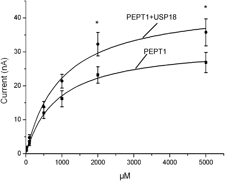 Fig 2. Coexpression of USP18 increases maximal electrogenic peptide transport in PEPT1-expressing Xenopus laevis oocytes.Arithmetic means ± SEM (n = 11–12) of Igly-gly as a function of glycine-glycine concentration in Xenopus laevis oocytes expressing PEPT1 without (black squares), or with (black circles) additional coexpression of wild type USP18. *(p<0.05) indicates statistically significant difference from the absence of USP18.
