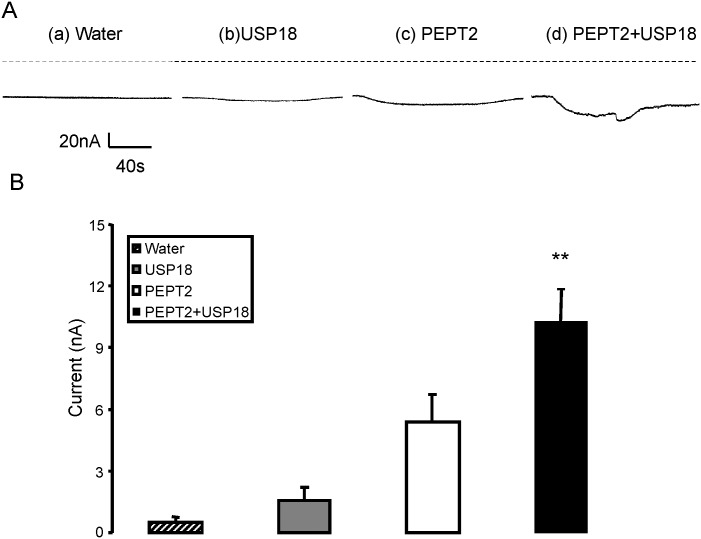 Fig 6. Coexpression of USP18 increases electrogenic peptide transport in PEPT2-expressing Xenopus laevis oocytes.A: Representative original tracings showing Igly-gly in Xenopus laevis oocytes injected with water (a) or expressing USP18 alone (b) or expressing PEPT2 without (c) or with additional coexpression of wild type USP18 (d). B: Arithmetic means ± SEM (n = 8–9) of Igly-gly in Xenopus oocytes injected with water (striped bar), expressing USP18 alone (grey bar), or expressing PEPT2 without (white bar) or with (black bar) wild type USP18. **(p<0.01) indicates statistically significant difference from the absence of USP18.