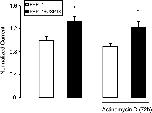Fig 5. Effect of USP18 on PEPT1 in absence and presence of Actinomycin D.Arithmetic means ± SEM (n = 15–16) of Igly-gly in Xenopus oocytes injected PEPT1 without (white bar) or with (black bar) wild type USP18 in the absence (left bars) and presence (right bars) of 50 nM Actinomycin D 72 hours prior to measurement. *(p<0.05) indicates statistically significant difference from the absence of USP18.