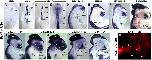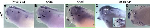 Figure 10. Time course of pax7 mRNA expression in Xenopus laevis. Lateral views, anterior to the left. Embryonic stages are indicated at the top. Inset in (D): pharyngeal arches and head mesenchyme were dissected away from the left side to reveal the brain. Up to stage 36, Pax7 expression is confined to the central nervous system including the ventral diencephalon (arrowhead), the hypophysis (hp), and the frontonasal neural crest cells. Weak expression is also seen in the somites. From stage 39 onwards, weak expression can be detected in craniofacial muscle anlagen. Abbreviations as before and: cg, cement gland; hp, hypophysis; ht, heart; first arch derived muscle: im, m. intermandibularis anlage; lm, m. levatores mandibulae anlage; second arch derived muscle: ih, m. interhyoideus anlage; oh, m. orbitohyoideus anlage; qh, m. quadrato-hyoangularis anlage; q/oh, common oh and qh precursor. |