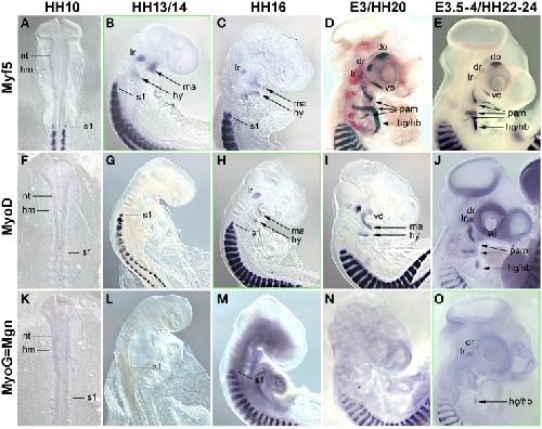Figure 4. Time course for the mRNA expression of Mrf transcriptions factors in chicken embryos from HH10-E4; orientation of specimen and frames indicating the onset of expression as in Figure 3. Gene names and developmental stages are displayed as in Figure 3, Abbreviations as in Figures 1, 3 and: hy, hyoid arch. Myf5 and MyoD indicate the myogenic commitment of precursor cells and are expressed in developing craniofacial muscle anlagen from HH13/14 (Myf5) and HH16 (MyoD) onwards, i.e., significantly before the onset of Pax7. Expression of Myogenin (MyoG/Mgn) indicates the entry of cells into muscle differentiation and commences at E3.5-4, i.e., about the same time as Pax7 (compare with Figure 1). |