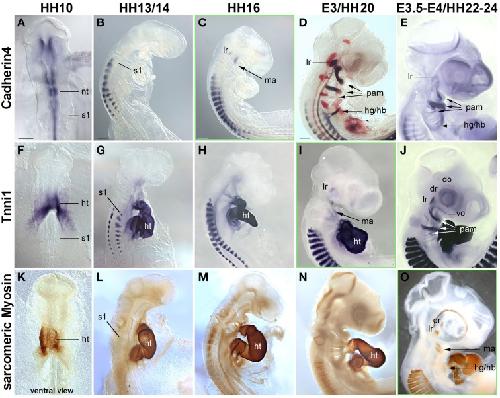 Figure 5. Time course in chicken embryos from HH10-E4 for markers indicating the cohesion of muscle anlagen (Cadherin 4–mRNA expression) and terminal differentiation [Troponin I 1 (Tnni1)–mRNA expression; sarcomeric Myosin–MF20 antibody staining]. Orientation of specimen and frames indicating the onset of expression as in Figures 3, 4; abbreviations as in Figures 1, 3, 4. The time course of Cadherin 4 expression resembles that of MyoD, and Tnni1 expression commences in many craniofacial muscle anlagen E3, i.e., both are expressed before or at the onset of Pax7 expression. Sarcomeric Myosins can be detected at E3.5-4, simultaneous to the onset of Pax7. |