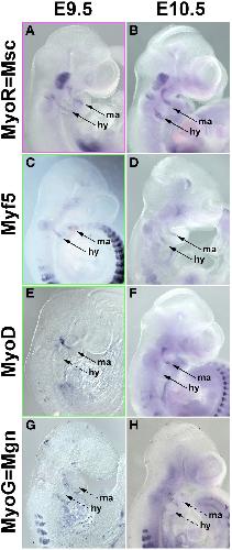 Figure 8. mRNA Expression of mouse head mesoderm markers and markers for myogenic commitment before and at the onset of Pax7 expression. Lateral views, dorsal to the top. Stages of development are indicated at the top of the panel, gene names on the left. (A,B) Musculin expression commences before E9.5 (not shown); at E9.5-10.5, the gene is widely expressed in the myogenic head mesoderm. Myf5 (C,D) and MyoD (E,F) expression commences at E9.5, i.e., before the onset of Pax7. (G,H) Myogenin expression is not yet detectable at these stages and commences slightly later at E11.5 (not shown). |
