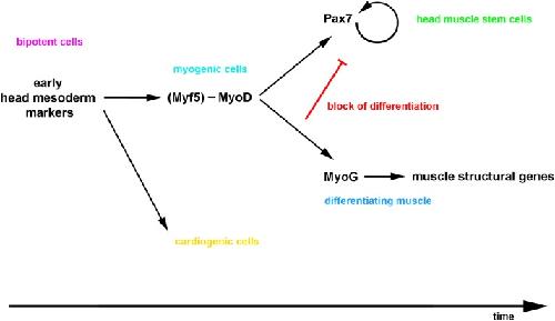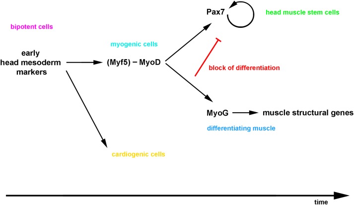Figure 14. Proposed model for the emergence of craniofacial muscle stem cells: the bi-potential head mesodermal cells commit to myogenesis before adapting a muscle stem cell state, and then a lateral inhibition mechanism initiated by the differentiating cells controls the simultaneous production of functional muscle and the maintenance of the stem cell pool. |