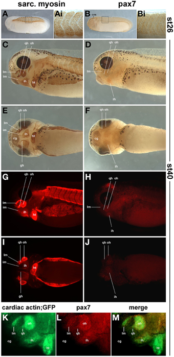 Figure 12. Sarcomeric myosin (A,C,E,G,I) and pax7 protein expression (B,D,F,H,J) in st26 Xenopus laevis control embryos and in craniofacial muscle anlagen embryos at st40. (KâM) GFP expression and pax7 protein expression in a st40 cardiac actin; GFP embryo. (A,B,C,D,G,H,K,L) lateral views, rostral to the left, dorsal; to the top; (E,F,I,J) ventral views, rostral to the left. In (AâF) a HRP-coupled secondary antibody was used, in (GâJ) a secondary antibody coupled to Alexa fluor 594. In (KâM), Alexa fluor 488 and 594 coupled secondary antibodies were used to detect anti GFP and pax7 primaries, respectively. The staining at st26 recapitulates the known myosin and pax7 expression patterns. At st40, the strong expression of sarcomeric myosin and the activity of the cardiac actin promoter indicate that in particular in muscle anlagen associated with the first (mandibular) and second (hyoid) pharyngeal arch, muscle differentiation is well under way. In these muscle anlagen, a faint expression is visible for pax7. The pattern is punctuate, as expected for a nuclear localisation of the pax7 protein. Abbreviations as in Figures 1, 10, 11 and: somite derived muscle: gh, m. geniohyoideus anlage. |