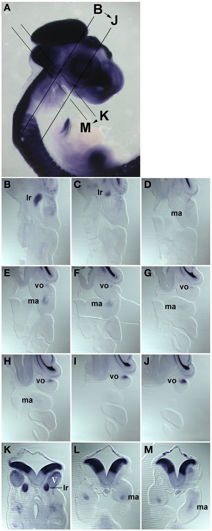 Figure 2. Series of frontal (B–J) and cross (K–M) sections of a HH22 chicken head, stained for the expression of Pax7 mRNA, the plane and order of sections in indicated in (A). (B–J) anterior to the top, lateral to the right; (K–M) dorsal to the top. Abbreviations as in Figure 1. The position of the Pax7 signals beneath the trigeminal ganglion, beneath the eye and in the core of the mandibular arch confirms that these are expression domains associated with developing head muscles. |