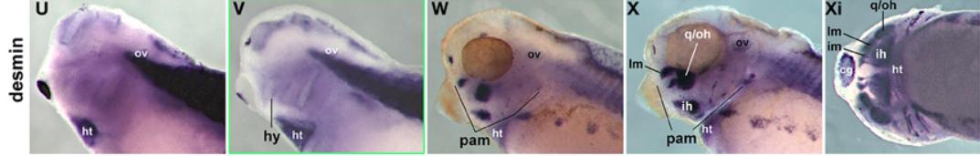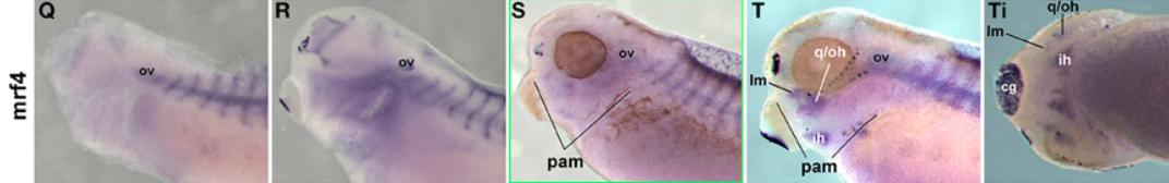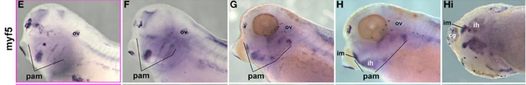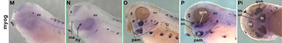 Figure 11 E- H'. Time course of myl5 () gene expression in Xenopus laevis, lateral views, anterior left, dorsal up. Key: pam: pharygeagel arch musculature; hp= hypophysis; ht= heart; hy = hyoid arch; im= m. intermandibularis primordium; lm= m. levatores mandibulae primordium; ih=m. interhyoideus primordium; oh= m. orbitohyoideus primordium; qh= m. quadrato-hyoangularis primordium; q/oh=common oh and qh precursor; ov= otic vesicle |