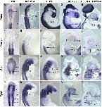Figure 11. Time course of head mesoderm and muscle gene expression in Xenopus laevis. Same stages, views, and abbreviations as in Figure 11; markers are indicated on the left. Note that msc, myf5, myod, myog, and desmin are expressed before, mrf4 concomitant with the onset of pax7 expression. |