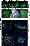 Figure 9. Lineage tracing of MyoD expressing cells in MyoDiCre/+ R26NG embryos, revealed by anti-GFP antibody (green) staining. (A–D) Lateral views of the right side of E10.5-E13.5 embryos; the dotted line indicates the sectional plane in (F–I). (Ei-iii) Lateral views of the left side of an E11.5 embryo, stained for Pax7 mRNA (blue) and GFP protein (green); dorsal to the top. (F) Frontal section of an E13.5 embryo, stained for Pax7 protein (red), GFP (green), and Dapi (blue). (G) Detail of the ventral rectus eye muscle, (H) detail of the tongue, (I) detail of the masseter as indicated in (D,F). The widely distributed bright green (F) or yellow cells (G–I) are autofluorescing blood cells. Cells with a history of MyoD expression can readily be detected at E10.5 and 11.5, first in the mandibular and hyoid arch, then in the developing extraocular muscles. In head-mesoderm-derived muscles, Pax7 mRNA and subsequent protein expression colocalises with that of MyoD-Cre driven GFP, and Pax7 containing nuclei reside in GFP expressing cells. In contrast, in the somite-derived tongue muscle, most Pax7-positive nuclei are not located in GFP expressing cells. Abbreviations as in Figures 1, 4, 5 and: eom, developing extraocular muscles. |
