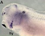 msc (musculin) gene expression in Xenopus laevis embryo, assayed via in situ hybridization, NF stage 33, lateral view, anterior left, dorsal up. Key: hy= hyoid arch; ov= otic vesicle. |