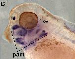 Figure 11 A- D. Time course of msc (musculin) gene expression in Xenopus laevis, lateral views, anterior left, dorsal up. Key: pam: pharygeagel arch musculature; hp= hypophysis; ht= heart; hy = hyoid arch; im= m. intermandibularis primordium; lm= m. levatores mandibulae primordium; ih=m. interhyoideus primordium; oh= m. orbitohyoideus primordium; qh= m. quadrato-hyoangularis primordium; q/oh=common oh and qh precursor; ov= otic vesicle |