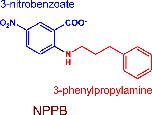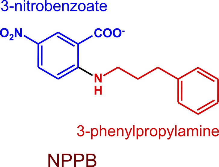 Figure 1. Structures of NPPB, 3NB, and 3PP. NPPB structure and its division into head (3NB, blue) and tail (3PP, red) parts. |