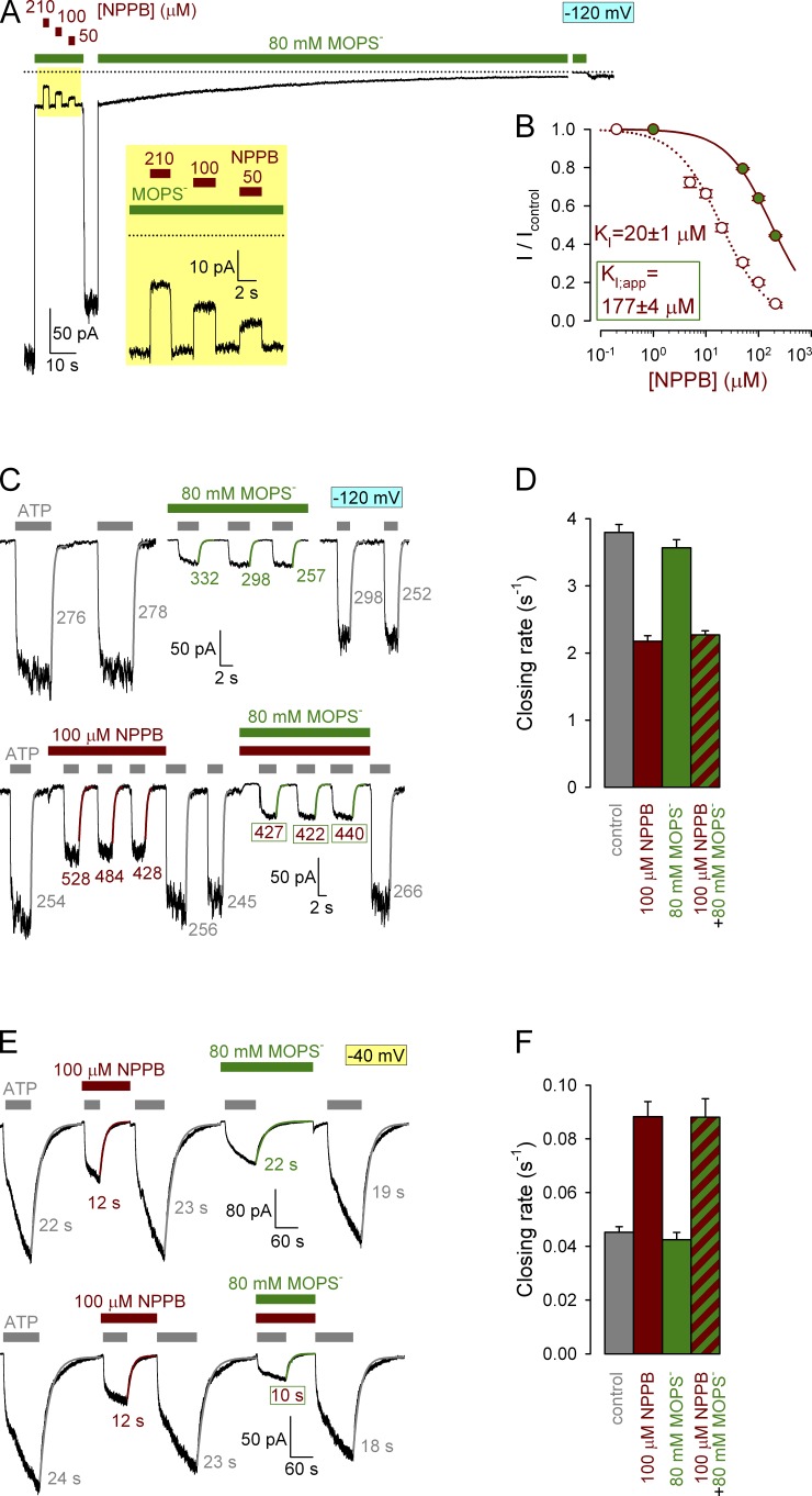 Figure 2. MOPS− competes with NPPB for binding in the pore but not at the gating site. (A) Macroscopic locked-open E1371S CFTR current at −120 mV after removal of ATP from the bath; exposures to various NPPB concentrations (brown bars) in the continued presence of 80 mM MOPS− (green bar; magnified in yellow inset). Dotted line marks zero-current level. (B) Dose–response curves for NPPB block at −120 mV in the absence (open symbols; replotted from Csanády and Töröcsik [2014]) and presence (green-filled symbols) of 80 mM MOPS−. Leftmost symbols in these and all other dose–response plots represent zero drug concentration. Fits to the Michaelis-Menten equation (dotted and solid line) reveal an approximate ninefold increase in the apparent KI of NPPB in the presence of 80 mM MOPS− (KI = 8.3 mM for MOPS−; compare with Csanády and Töröcsik [2014]). (C) Macroscopic WT CFTR currents at −120 mV elicited by brief exposures to 2 mM ATP in the absence or presence of blockers. Current relaxations after ATP removal were fitted by single exponentials (colored lines), and colored numbers are time constants (in milliseconds). (D) Macroscopic closing rates of WT CFTR in the absence of blocker (gray) and in the presence of 100 µM NPPB (brown), 80 mM MOPS− (green), or 100 µM NPPB + 80 mM MOPS− (striped). (E) Macroscopic K1250A CFTR currents at −40 mV elicited by brief exposures to 10 mM ATP in the absence or presence of blockers. Current relaxations after ATP removal were fitted by single exponentials with time constants indicated. (F) Macroscopic K1250A closing rates in the absence of blocker (gray) and in the presence of 100 µM NPPB (brown), 80 mM MOPS− (green), or 100 µM NPPB + 80 mM MOPS− (striped). Mean ± SEM is shown. |