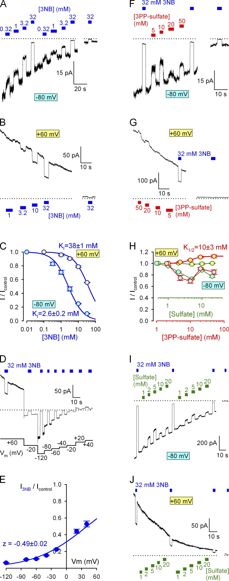 Figure 3. Effects of 3NB, 3PP, and sulfate on CFTR permeation. (A, B, F, G, I, and J) Decaying macroscopic currents of locked-open K1250A CFTR channels after removal of ATP, recorded at membrane potentials of −80 (A, F, and I) or 60 mV (B, G, and J) and responses to brief applications of various concentrations of 3NB (A and B, blue bars), 3PP-sulfate (F and G, red bars), or sulfate (I and J, green bars). Zero-current levels (dotted lines) were estimated from the responses of final current segments to application of 32 mM 3NB (blue bars in all panels). (C and H) Dose–response curves at −80 (cyan-filled symbols) and 60 mV (yellow-filled symbols) of fractional currents as a function of [3NB] (C), [3PP-sulfate] (H, red), and sulfate (H, green). The two alternative abscissae in H were scaled to reflect the presence of 0.45 mol/mol sulfate ions in 3PP-sulfate; i.e., the green abscissa correctly reflects sulfate concentrations for all four plots. The plots in C were fitted by the Michaelis-Menten and the yellow–red plot in H to the Hill equation, and midpoints are printed in the panels. (D) Responses of decaying macroscopic locked-open K1250A CFTR current to brief applications of 32 mM 3NB (blue bars) at various membrane potentials. Zero-current level (dotted line) was estimated from the final current segment after subtraction of the small (∼2 pA/60 mV) linear seal current. (E) Voltage dependence of macroscopic current block by 32 mM 3NB (symbols) and Boltzmann fit (solid line) yielding parameters z = 0.49 ± 0.02 mV and V1/2 = 41 ± 2 mV (calculated Kd(0) = 14.7 mM). Mean ± SEM is shown. |